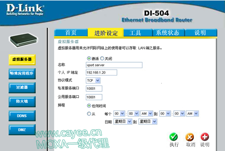 在圖中的名稱欄里輸入虛擬服務(wù)器的名稱,個(gè)人IP地址欄輸入做服務(wù)器端Xport的IP地址,協(xié)議模式采用的是TCP,端口欄輸入Xport的本地端口號(hào)。以上是D-Link路由器的設(shè)置,不同品牌路由器設(shè)置方法類似。